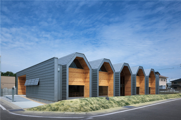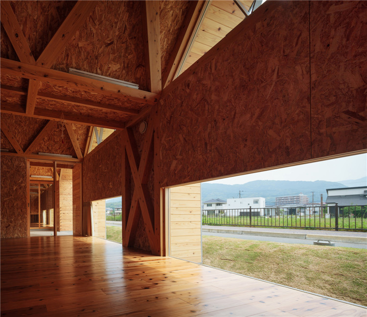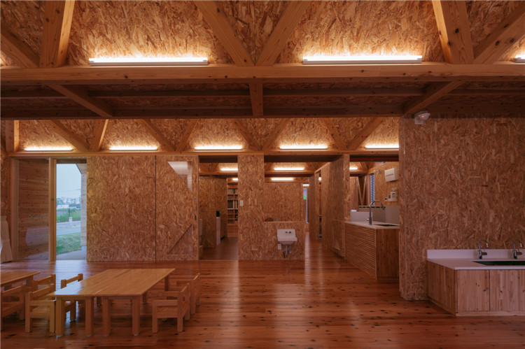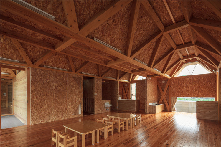 本案托兒所位于福岡市附近的太宰府市,為了容納更多的孩子,不得不增加為兩個班級??紤]到日本全國范圍的出生率下降,不久的將來這里的孩子數(shù)量可能會減少,因此建筑師決定建造一座只有一室空間(9米跨度)的建筑,內(nèi)部沒有支柱,方便各種用途(游戲室等)的轉(zhuǎn)換。木桁架梁在工廠安裝,用拖車運(yùn)送到施工現(xiàn)場。復(fù)雜的連接也是在工廠制作的,只有一個相對容易的連接在現(xiàn)場組裝。這樣的方式提高了施工精度,縮短了施工工期。