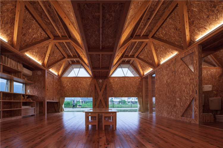 屋頂結(jié)構(gòu)采用折疊板設(shè)計,無柱空間是通過運(yùn)用木桁架梁屋頂結(jié)構(gòu)實現(xiàn)的,形狀像一塊折疊板。所有支撐屋頂結(jié)構(gòu)的承重墻都被布置在建筑外圍?,F(xiàn)在這座建筑分成了兩個保育室、衛(wèi)生間等,但將來也可以轉(zhuǎn)換為一個大房間。