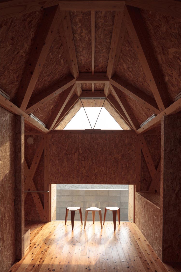 建筑的所有結(jié)構(gòu)不是天花板就是墻體,木桁架梁傾斜設(shè)置,是屋頂?shù)幕A(chǔ)結(jié)構(gòu)木構(gòu)件。這樣的設(shè)計滿足了客戶對于“保育室被木頭包圍”的要求,減少了建設(shè)成本。此外,通過降低天花板的高度,木材長度被縮短了,對空調(diào)的需求也降低了。由于天花板幾何形狀不規(guī)則且窗戶為梯形,因此雖然天花板最低的地方只有2.2m左右,但即使是成年人也不會感到壓抑。