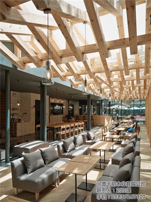且新增的木梁在原有的鋼梁結(jié)構(gòu)之間交織穿梭,形成豐富有層次的光影效果,尤其是在天氣晴好的時候,體驗(yàn)感更為直接。對于空間區(qū)域的分割,設(shè)計(jì)團(tuán)隊(duì)也著手從天花板部分來創(chuàng)造。比如前述提到的主要的編織木梁結(jié)構(gòu),其下方的空間寬敞明亮,更適合于那些喜愛沐浴在陽光或自然天光之下的客人們。而靠近建筑內(nèi)部的空間,在灰黑色的天花板映襯之下,則要顯得沉穩(wěn)、私密一些,顯然更適合那些需要安靜空間的客人們。