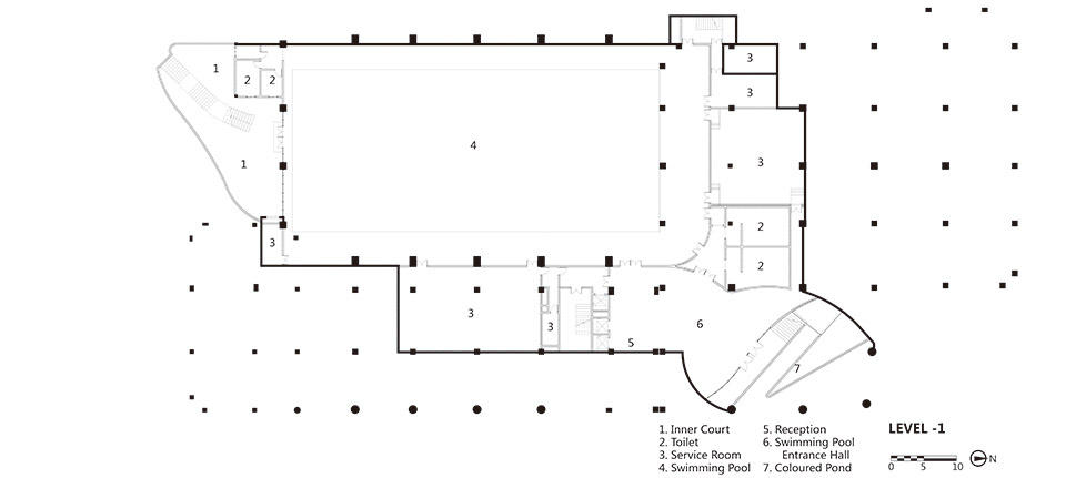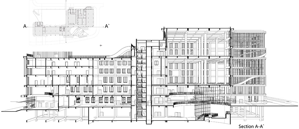 我們希望通過這個項目喚起我們的父輩及下一代的歸宿感。農(nóng)業(yè)生產(chǎn)是那個時代“集體式生活”的標(biāo)志,自然地貌便是這一代人集體記憶的背景。我們通過對建筑空間在“地面”層面上的疊加,再現(xiàn)了自然地貌:在城市層面上,由于本項目地處城市擴張的邊界,位于較低的洼地地形,面鄰一個保留的綠化高地,我們在建筑手法上引入一系列上下錯開的水平樓板來使這兩種極端的地貌形成空間上的對話;在建筑尺度,我們轉(zhuǎn)譯了這種拓?fù)潢P(guān)系為一種多層樓板的空間類型,例如地下室空間轉(zhuǎn)折到首層入口層,接著又垂直延伸到二層空間,并不斷交錯向上;在細(xì)部層面,我們使用了木紋鋁方通遮陽板系統(tǒng)將豐富的地景引入到室內(nèi),是對本土的竹材結(jié)構(gòu)建筑形制所做出的回應(yīng)。