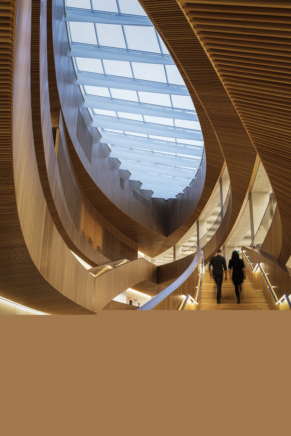 底層的外立面并未使用透明的六邊形,而是設(shè)計(jì)成了凹進(jìn)去的寬闊木質(zhì)拱頂,人們?cè)谶M(jìn)入圖書(shū)館的時(shí)候會(huì)產(chǎn)生被環(huán)抱的感覺(jué)。圖書(shū)館入口處結(jié)構(gòu)參考了當(dāng)?shù)爻R?jiàn)的Chinook云拱。入口處的雙曲面木質(zhì)拱廊是世界上最大的自由曲面木質(zhì)外殼之一,材質(zhì)選用了不列顛哥倫比亞省西部產(chǎn)的紅杉木。其有機(jī)形態(tài)和質(zhì)感讓大型建筑的尺度變得親密。從圖書(shū)館外面就能看到中庭,仿佛在邀請(qǐng)人們進(jìn)入。