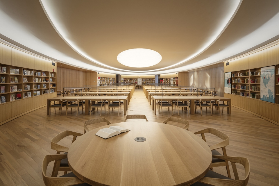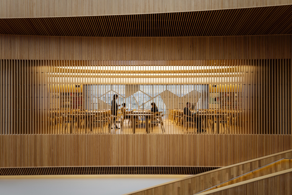 圖書(shū)館共有六層,分布著各種空間,比如數(shù)字空間,模擬空間,群體空間以及個(gè)人互動(dòng)空間。圖書(shū)館頂層是大閱覽室,建筑師在設(shè)計(jì)時(shí),把它構(gòu)想成藏在圖書(shū)館的珠寶盒,人們可以在這兒潛心研究,尋找靈感。進(jìn)入大閱覽室之前要先經(jīng)過(guò)一個(gè)過(guò)渡空間,過(guò)渡空間光線(xiàn)柔和,聲效優(yōu)良。室內(nèi)利用木質(zhì)格柵而非實(shí)體墻壁來(lái)環(huán)繞空間,這樣既保證了隱私,又有一定的可見(jiàn)度。陽(yáng)光透過(guò)木條的縫隙照亮了中庭和西立面之間的空間。
