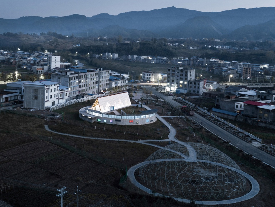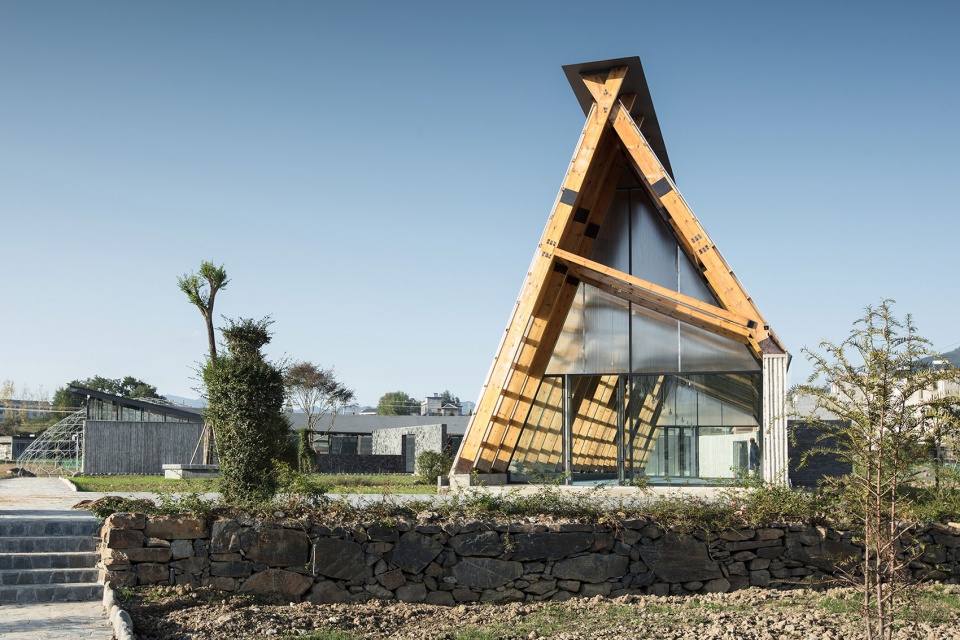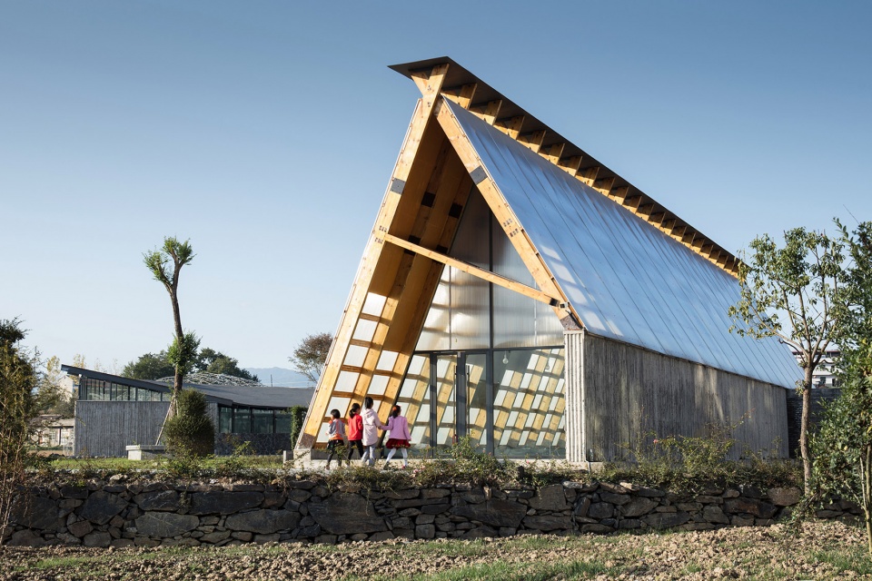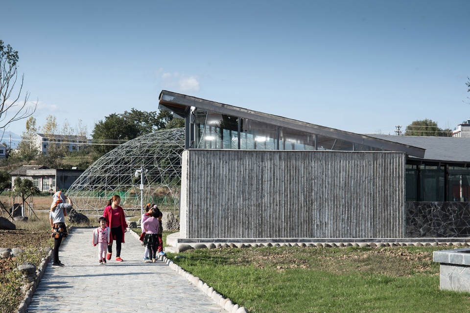 建筑需要面對新的長龍大道,也需要對新老路的轉(zhuǎn)角空間進(jìn)行回應(yīng)。墻體遇到親子活動(dòng)的部分,折疊成弧形空間,包裹出其所需的室內(nèi)外場所;而在接待的部分,墻體則流動(dòng)成線性空間,如巷道般通向村口,作為視覺和功能的導(dǎo)引,其正面又剛好圍合出面對長龍大道的入口場地,同時(shí),巷道的另一個(gè)出入口也自然融入到親子活動(dòng)的路徑上。