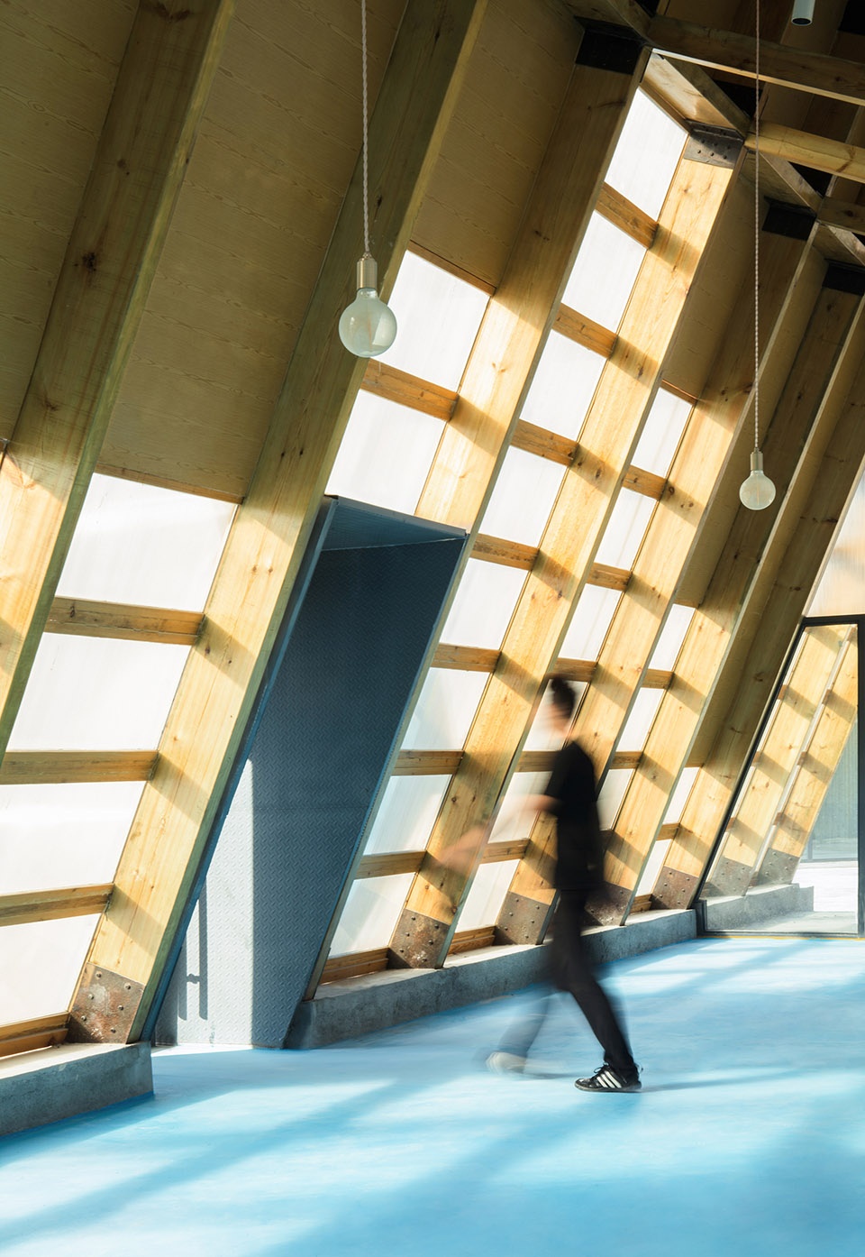 直線空間采用木結(jié)構(gòu)形成交叉的構(gòu)件,中間用斜撐連接,頂部利用交叉形成的平面,蓋上鋼板作為防水構(gòu)造的一部分,木結(jié)構(gòu)外采用陽光板覆蓋,使光線柔和進(jìn)入室內(nèi),而內(nèi)部則根據(jù)西向的日照分析曲線嵌入高低錯(cuò)落的木板以減少頂部的陽光輻射。
