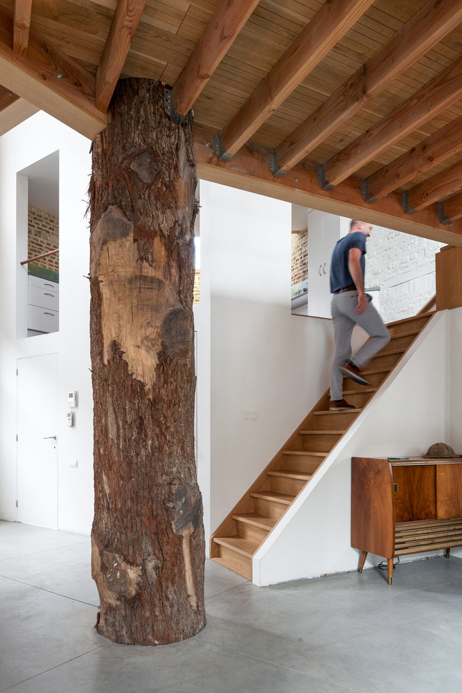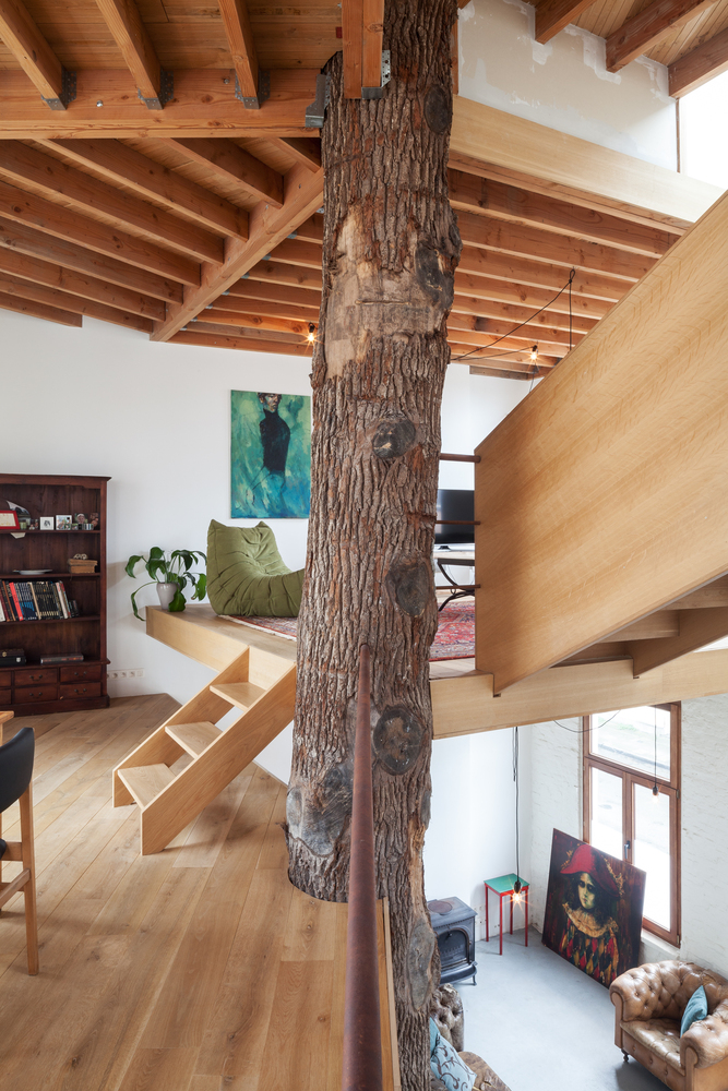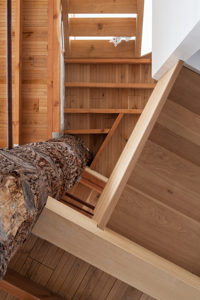 一段橡樹樹干被放置在五邊形平面正中間,作為新的支撐結(jié)構(gòu)。新的上層樓層懸掛在原有外墻和中心支柱之間,呈螺旋式上升。這樣就在生活區(qū)域內(nèi)創(chuàng)造出沒有任何內(nèi)墻的開放室內(nèi)空間。樹干中柱是一個(gè)合乎邏輯且經(jīng)濟(jì)實(shí)惠的解決方案,它立即為新居所帶來了合適的氛圍。衛(wèi)生間、廚房、入口和儲(chǔ)藏室/洗衣房都設(shè)置在縱貫上下的封閉體塊中。