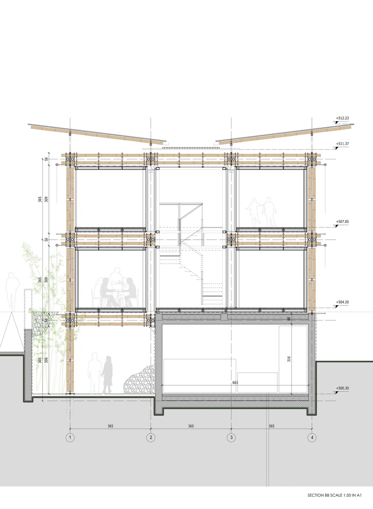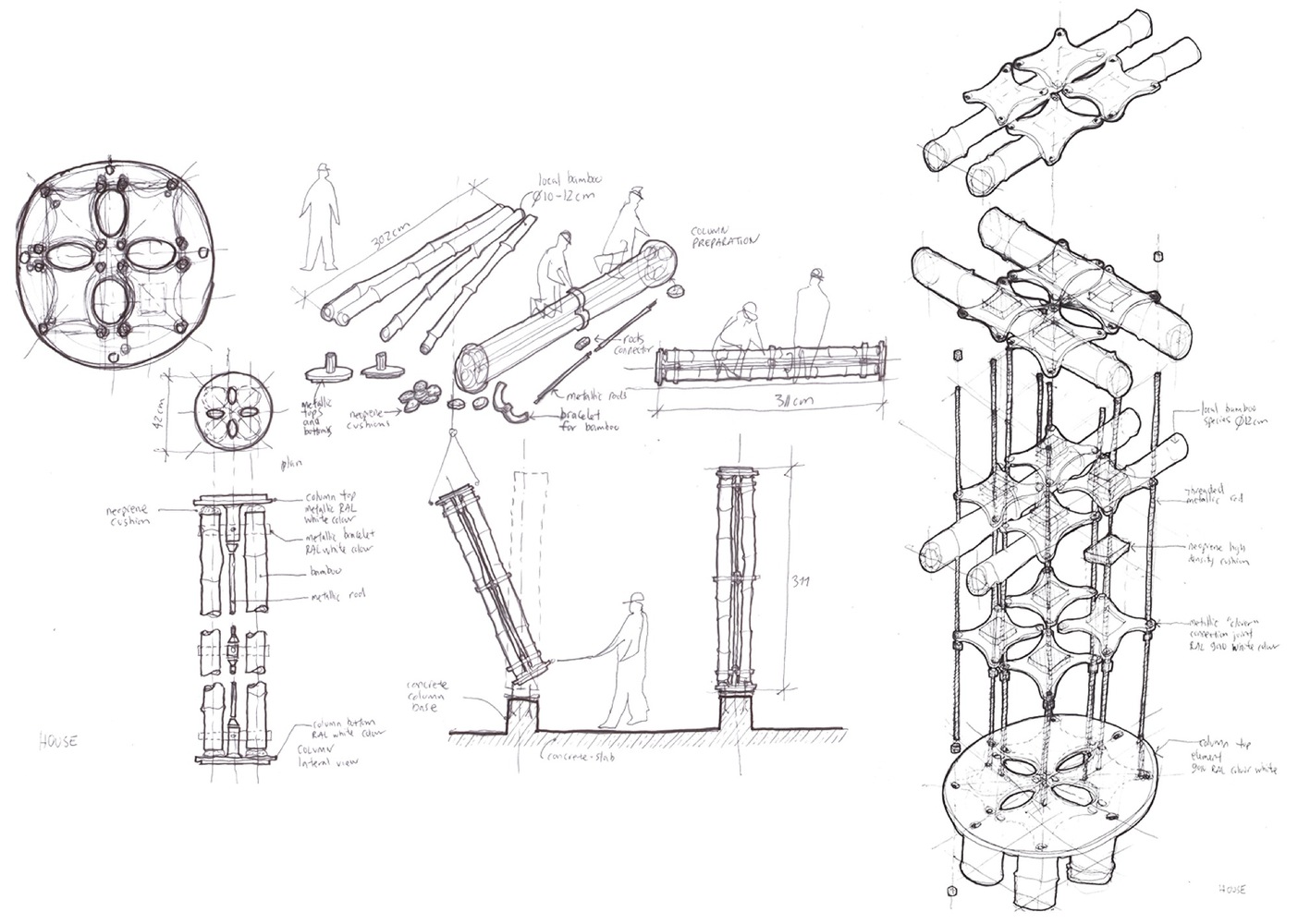 對(duì)于房子的結(jié)構(gòu),我們探索了以竹子為建筑材料的新方法。對(duì)我們而言,可持續(xù)發(fā)展不僅僅是使用竹子等天然材料,而是設(shè)計(jì)適當(dāng)?shù)氖┕し桨福?/span>