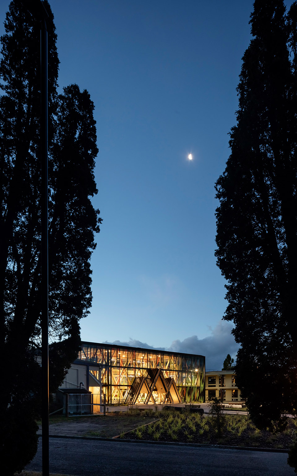 “Te Whare Nui o Tuteata”木材創(chuàng)新中心的落成代表了新西蘭逾十年來在木材研究上的進(jìn)步與技術(shù)的成熟,木材不再是僅僅作為支撐結(jié)構(gòu)被簡單地組合在一起,而是被概念化了。該項目旨在造福未來,并鼓勵公眾參與到環(huán)境保護(hù)的大潮中。通過更加深入地思考木材的優(yōu)勢,以及開發(fā)更加優(yōu)質(zhì)的預(yù)制與拼裝木結(jié)構(gòu)建筑,“Te Whare Nui o Tuteata”成功地向大眾作出了一場具有全球意義的科學(xué)演示,向人們展示出如何建造更好的明天。