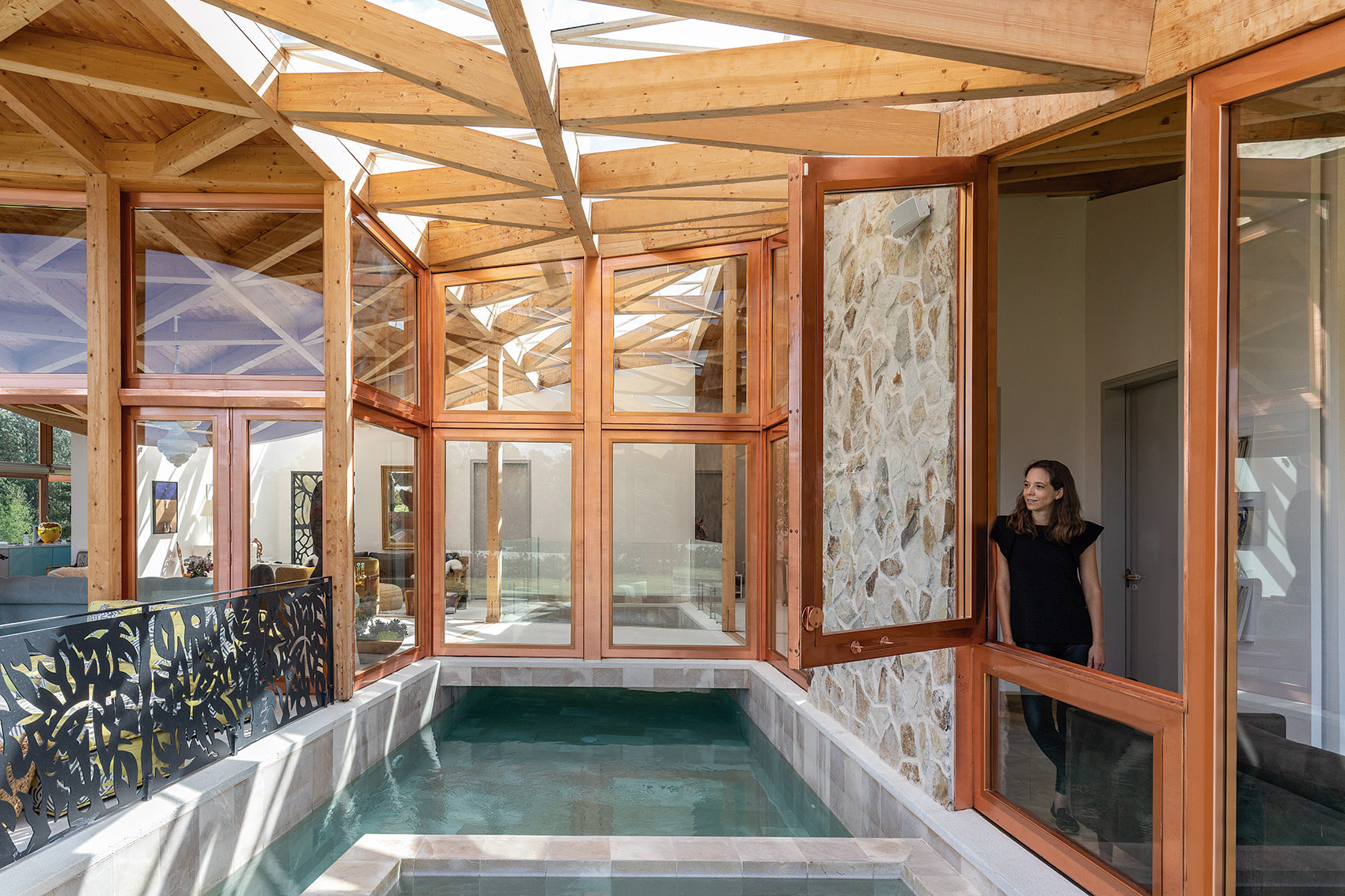 在室內(nèi),一處位于平面中央的縫隙空間將住宅明確地劃分為社交空間和私人空間兩部分,同時(shí)也在形式上保留了“莊園住宅”的傳統(tǒng)布局。天窗照亮了室內(nèi)外水池與中央交通空間,同時(shí)創(chuàng)造出交叉通風(fēng)與拔風(fēng)效應(yīng),以綠色的生物氣候策略營(yíng)造出舒適的室內(nèi)體感環(huán)境。